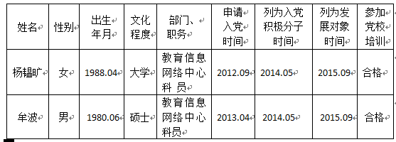 经本人申请、组织培训、党支部考察,报机关党委预审同意,下列同志被列为近期新党员发展对象。为保证发展党员质量,增强工作透明度,特向党内外群众进行公示。如对下列发展对象有异议的,请实事求是、客观公正地反映。