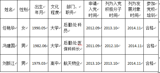 经本人申请、组织培训、党支部考察,报机关党委预审同意,下列同志被列为近期新党员发展对象。为保证发展党员质量,增强工作透明度,特向党内外群众进行公示。如对下列发展对象有异议的,请实事求是、客观公正地反映。
