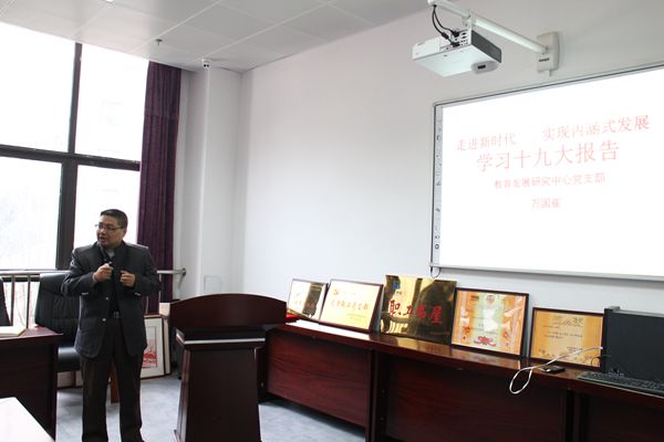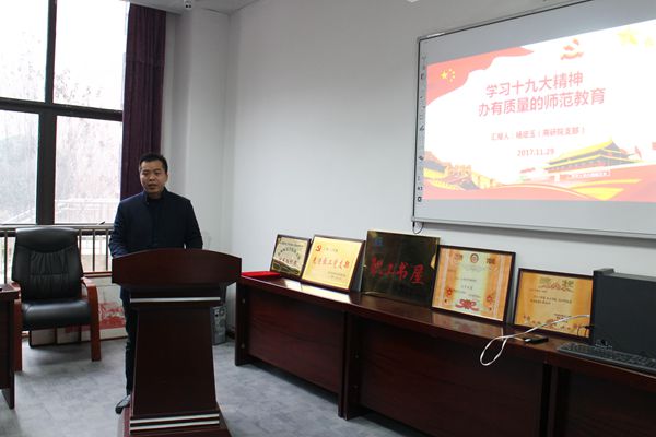 会议最后进行了十一月份建设学习型基层党组织上“微党课”。“微党课”围绕当前首要政治任务,将学习宣传十九大精神作为主要内容进行。这次上“微党课”,分别是党政办党支部书记赵刚上《深入学习贯彻党的十九大精神 感恩奋进做敢于担当的师院人》、学生资助中心党支部书记张金富上《新时代中国特色社会主义思想和基本方略》、高研院党支部书记杨定玉上《学习十九大 办有质量的师范教育》、科研处党支部书记余乐正上《加快双一流建设 实现内涵式发展》、教育发展研究中心党支部书记万国崔上《十九大报告精神学习》、教师工作处党支部书记吴敏上《牢记习总书记嘱托 加强教师专业培训---学习十九大报告和习近平总书记参加贵州代表团讨论时重要讲话精神》。